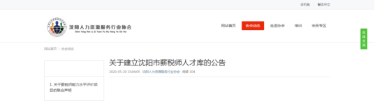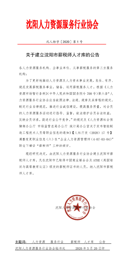 关于建立沈阳市薪税师人才库的公告5月20日,沈阳人力资源服务行业协会发布了《关于建立沈阳市薪税师人才库的公告》。公告明确,凡在沈阳市已取得中国商业联合会及ATHE(英国培训与高等教育认证)颁发的薪税师证书的人员,纳入沈阳市薪税师人才库。